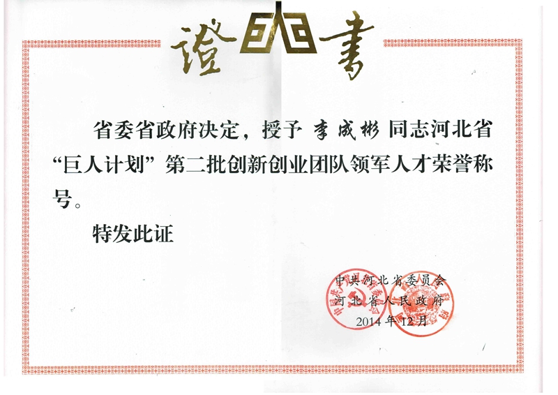 光源太陽能董事長李成彬,被授予河北省“巨人計劃”第二批創(chuàng)新創(chuàng)業(yè)團(tuán)隊領(lǐng)軍人才榮譽(yù)證書