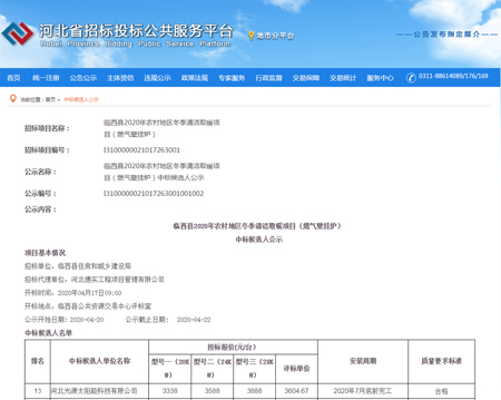 日前,河北省招標(biāo)投標(biāo)公共服務(wù)平臺(tái)網(wǎng)發(fā)布了“臨西縣2020年農(nóng)村地區(qū)冬季清潔取暖項(xiàng)目”公告中,光源春壁掛爐成功中標(biāo)。