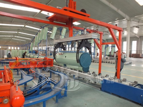 該生產(chǎn)線水箱發(fā)泡采用臥式無氟高壓定量一次發(fā)泡工藝,是國內(nèi)第一家,也是目前國內(nèi)最先進(jìn)的發(fā)泡線;內(nèi)外桶組裝完成后由機(jī)械手自動抓取,放到工藝小車上,發(fā)泡完成后也由機(jī)械手來完成水箱的下件工作,減輕了工人的勞動強(qiáng)度,減少了搬運過程中的磕碰等現(xiàn)象;發(fā)泡完成后水箱由錐滾線和升降機(jī)自動運送到地下室,屬首家采用地下室恒溫保溫工藝,節(jié)約能源,保證生產(chǎn)出的水箱具有穩(wěn)定的質(zhì)量。