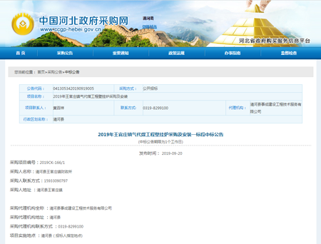中標喜訊 | 喜報頻傳 再創(chuàng)佳績 光源又獲大標 | 2019年王官莊鎮(zhèn)氣代煤工程壁掛爐采購及安裝